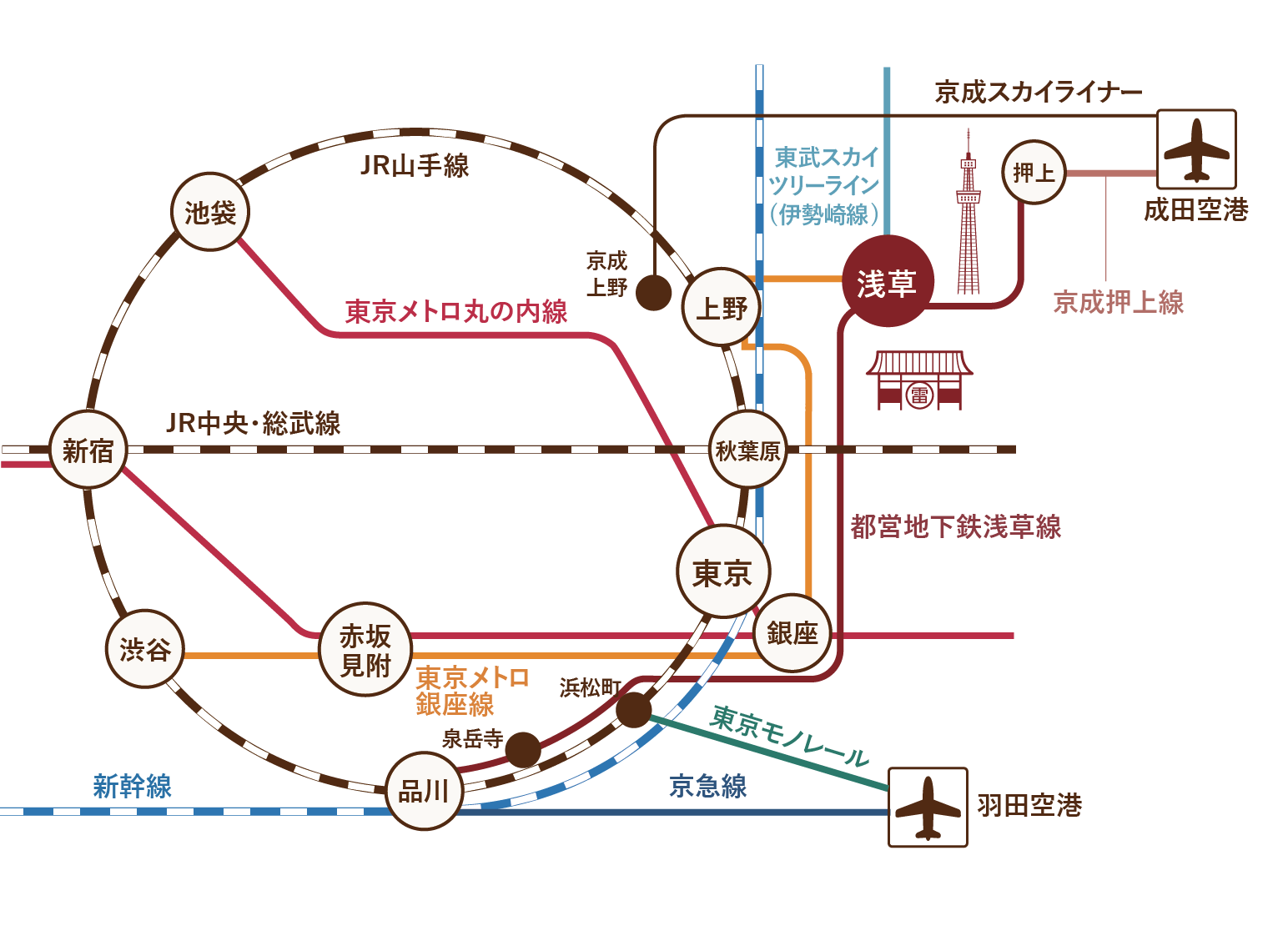 - 成田空港駅 → (京成スカイライナー) → 京成上野駅 → (徒歩約6分) → 地下鉄銀座線上野駅 → (東京メトロ銀座線) → 浅草駅1番出口より徒歩5分