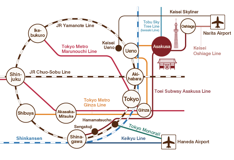 - Narita Airport Station → (Keisei Skyliner) → Keisei Ueno Station → 6-minute walk → Ginza Subway Line Ueno Station → (Tokyo Metro Ginza Line) → Asakusa Station → 5-minute walk from Exit 1 :