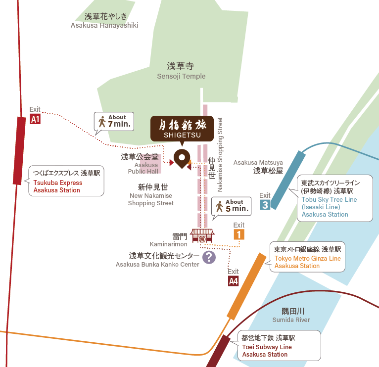 - (JR Yamanote Line, Keihin Tohoku Line) → Ueno Station → (Tokyo Metro Ginza Line) → Asakusa Station, 5-minute walk from Exit 1 :