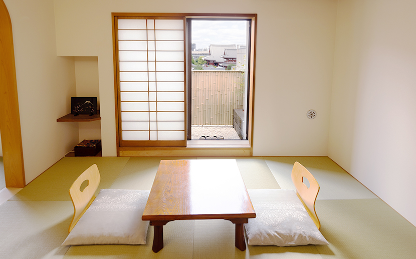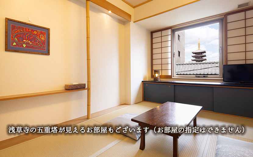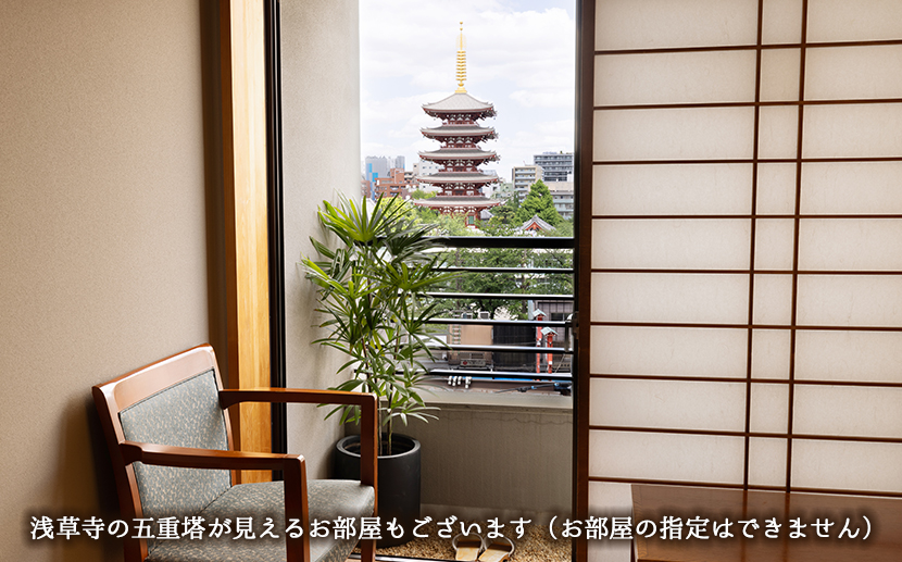 小さなベランダからは正面に浅草寺を望むことができます。当館で最も広い部屋となっています。