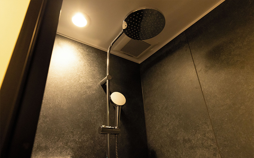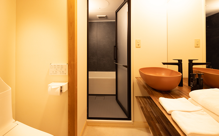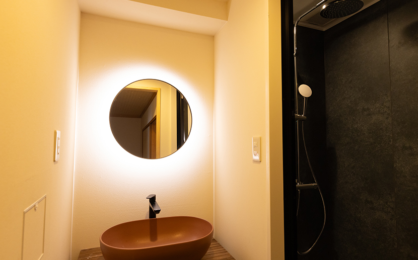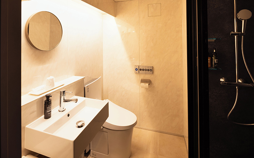 独立型のスタイリッシュなシャワーブース・洗面台とトイレスペース(ウォシュレット)は別々に備えています。