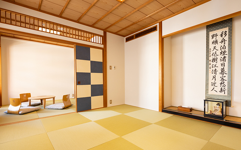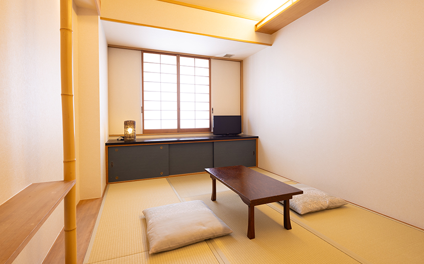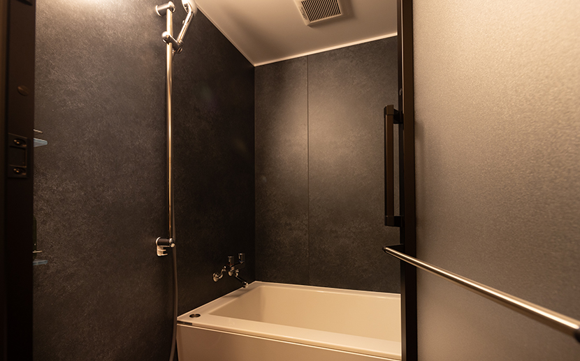 畳縁のない半畳サイズの畳を市松模様に敷いた琉球畳仕様に。2024年3月、ユニットバス・シャワーブースをリニューアルいたしました。